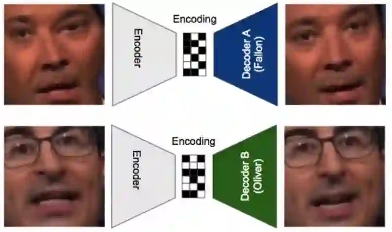 DeepFakes 让一个编码器把一个人脸压缩成一个代码和两个解码器,一个将其还原成人物 A(Fallon),另一个还原成人物 B(Oliver)。