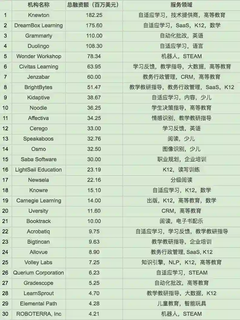 具体来看,美国AI+教育公司总融资额前 30 分别如下:
