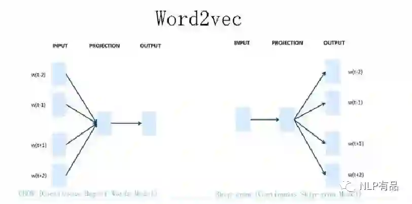 Word2Vec 有两种训练方法:用语言模型 CBOW 和 Skip-gram。1)CBOW的核心思想是从一个句子里面把一个词抠掉,用这个词的上文和下文去预测被抠掉的这个词;2)Skip-gram和 CBOW 正好反过来,输入某个单词,要求网络预测它的上下文单词。