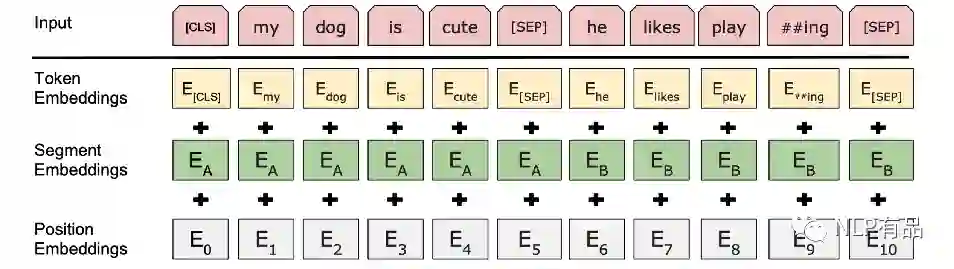 Segment Embedding:词的句子级特征嵌入,针对双句子输入任务,做句子A,B嵌入,针对单句子任务,只做句子A嵌入;