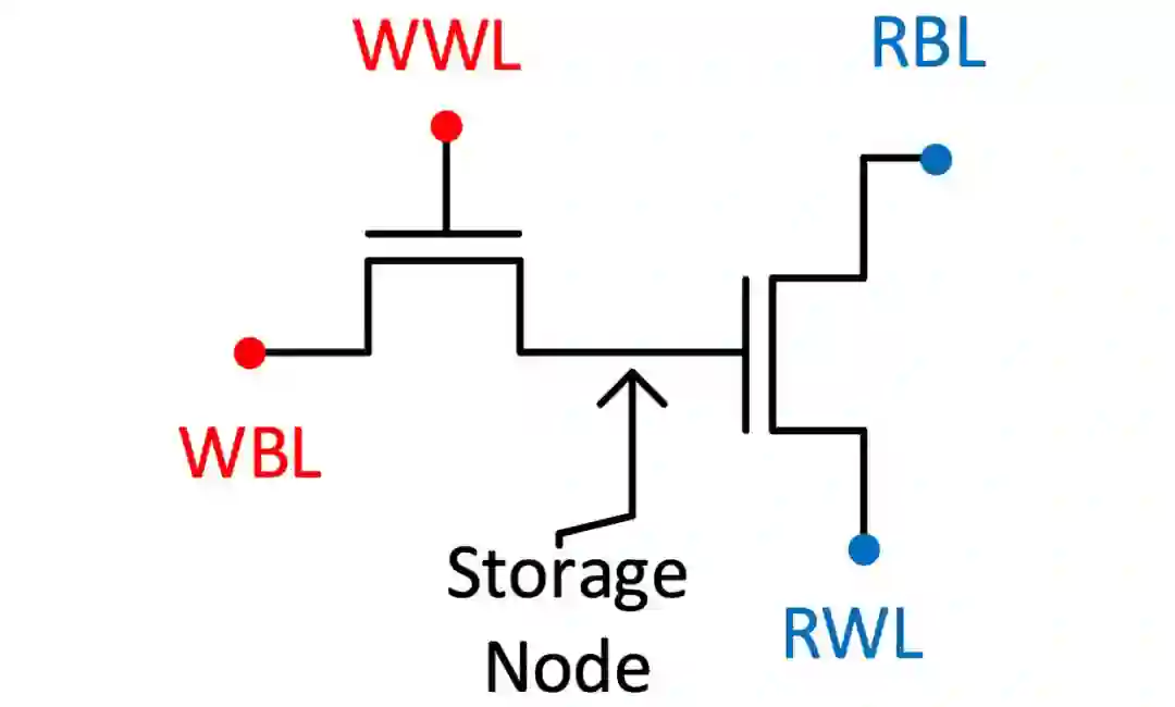 与由晶体管和电容器组成的普通 DRAM 不同,2T0C 嵌入式 DRAM 由两个晶体管组成。该位存储在右侧晶体管的电容中,并由左侧设备放置在此处。右侧设备栅极上的电荷意味着电流可以流过它,因此仅由晶体管控制读取和写入。