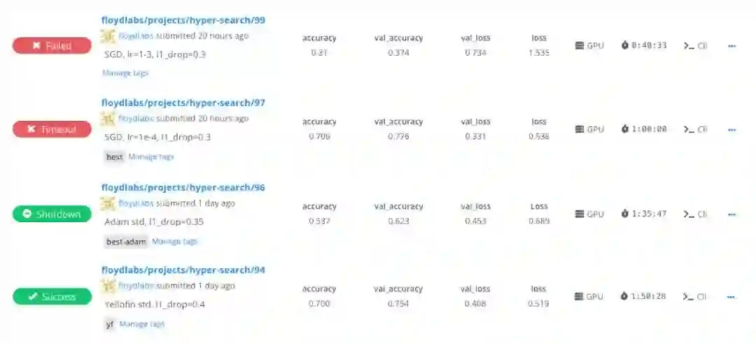 下图显示了FloydHub项目中的任务列表。可以看到,该用户正在使用任务消息,突出显示在这些任务中使用的超参数。