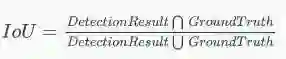 交除并可以理解为系统预测出来的框与原来图片中标记的框的重合程度。计算方法即检测结果 Detection Result 与 Ground Truth 的交集比上它们的并集,即为检测的准确率,如下图所示: