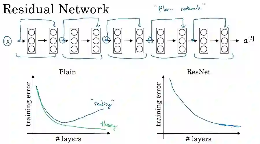 对普通网络而言,由于梯度下降和爆炸,训练误差并不会随着层数增加而单调递减。这些网络具有前馈跳过连接,使你训练极其庞大的网络而不会出现性能下降的情况。
