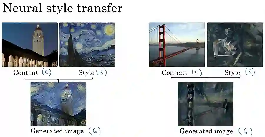 吴恩达讲解了如何将内容和风格相结合生成一个图像。示例如下图所示: