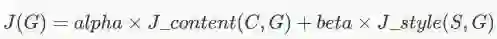 要构建一个神经风格迁移图像,你只需定义一个成本函数(cost function),这是一个内容和风格相似点的凸组合(convex combination)。详细地说,这个成本函数这样表示: