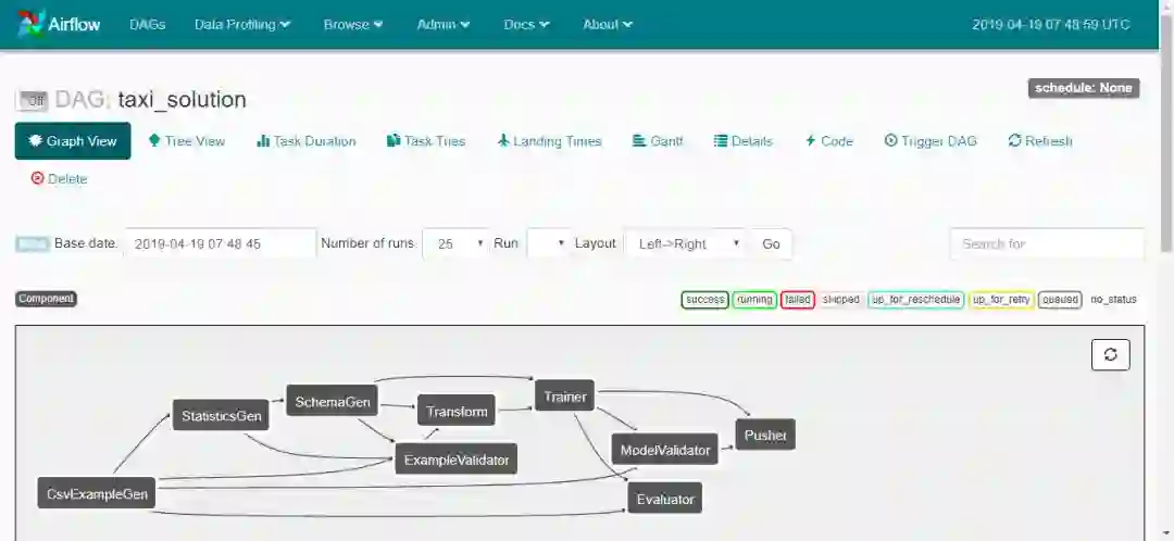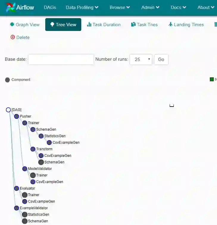 《TFX: A TensorFlow-Based Production-Scale Machine Learning Platform》是谷歌一帮人在KDD 2017上发表的 Applied Data Science Paper,介绍了产品级机器学习平台TensorFlow Extended,缩写为TFX。TensorBoard可以可视化神经网络的组件、日志等,而TFX可用于可视化整个机器学习流水线,例如CSV数据读取、交叉验证等以及他们之间的依赖、流程等: