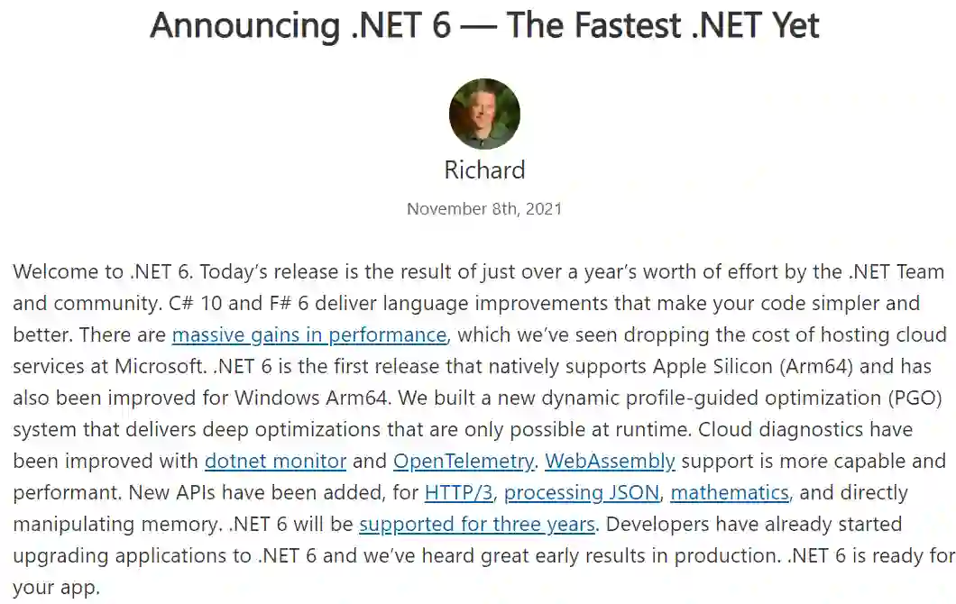 据微软公告,.NET 6 是首个原生支持 Apple Silicon(Arm64)的版本,并且还针对 Windows Arm64 进行了改进。.NET 团队构建了一个新的动态配置文件引导优化(PGO)系统,该系统可提供仅在运行时才会进行的深度优化。其他变化包括使用 dotnet monitor 和 OpenTelemetry 改进云诊断、提供更强大和更高效的 WebAssembly 支持,以及添加用于 HTTP/3、JSON 处理、数学和直接操作内存的新 API。作为 LTS 长期支持版本,.NET 6 将会获得 3 年的技术支持。