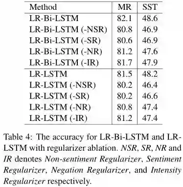 Linguistically Regularized LSTM是把语言学规则(包括情感词典、否定词和程度副词)以约束的形式和LSTM结合起来。作者定义了四种规则来将语言学知识结合进来,每一个规则主要是考虑当前词和它相邻位置词的情感分布来定义的。