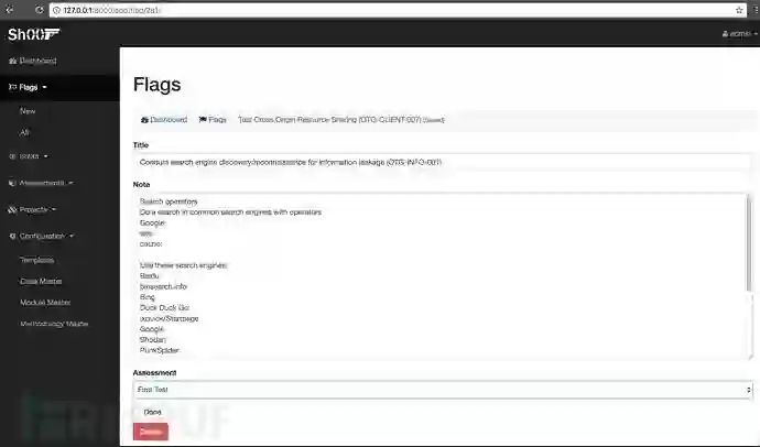 Sh00t是一个高可定制的渗透测试管理工具,它强调让测试人员手动进行安全测试,并让你专注于执行安全测试任务的本身。此外,Sh00t还为我们提供了测试用例的待办事项清单,以及可以使用自定义的漏洞报告模板来生成漏洞报告。