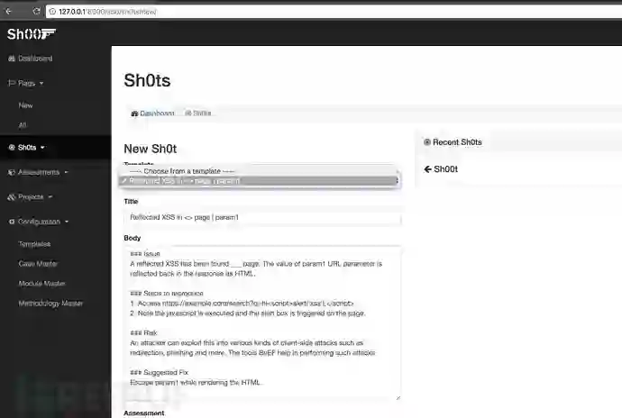 每当确认一个Flag为有效bug时,就会创建一个Sh0t。可以选择最匹配的bug模板,sh00t将根据所选模板自动填充漏洞报告。