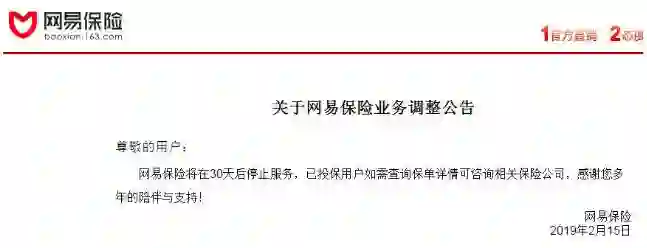 网易保险发布公告称,网易保险将于2019年3月中旬正式停止服务。已投保用户如需查询保单详情可咨询相关保险公司。