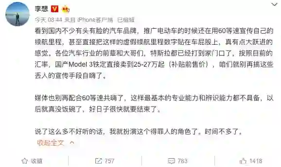 针对电动汽车的宣传乱象,车和家CEO李想发微博表示,“不少汽车品牌推广电动车的时候还在用60等速宣传自己的续航里程,甚至直接把这样的虚假续航里程数字贴在车屁股上,真有点大跃进的感觉。”
