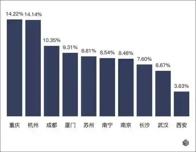 从图3-图7可以看出,在流入城市中,重庆对北上广深流出人口均具有较高的吸引力,流入总量占比最高,成为最受逃离人群青睐的城市,其次为杭州、成都、厦门、苏州、南宁、南京、长沙、武汉等。从整体上来看,逃离人群流入地区仍以周边潜力城市为主。