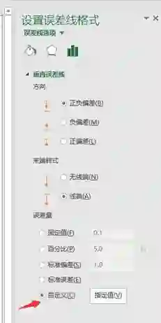 4)点击更多选项,可以设置误差线的格式。如正负偏差,末端样式和自定义误差数据,上下限可以不同。