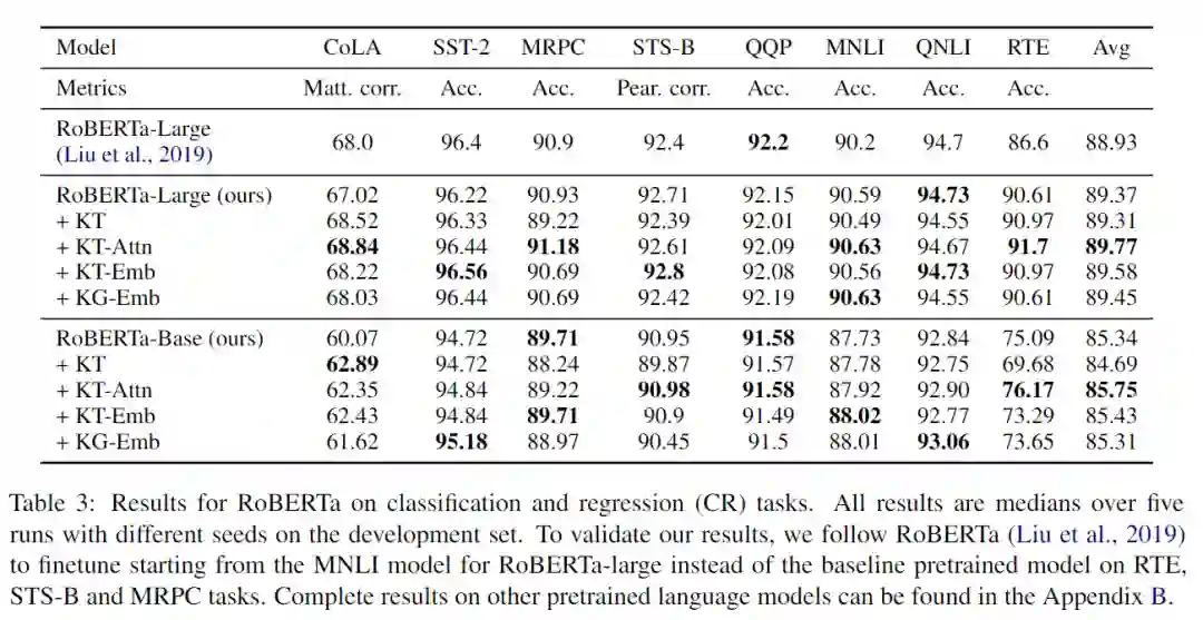 其中,KT 方式的知识来自于 Wikitonary 词典数据,通过词性标注等方式查到对应的词,将词典中的释义看作是知识,加入到任务之中。KG-Emb 的方式,则是使用 Wikidata 的数据,将图谱知识融合到任务中。其中 KT-Attn 方式是我心中比较理想的增强方式,而 KT-Emb 方法是我没有想到过的,但是看了文章之后我也尝试理解了这个方法,感觉上也是 make sense 的。