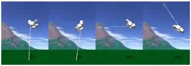 图 2. 利用潜在的能量来撑杆跳。进化算法发现创造一个能够倒下和翻转的生物,比制造积极跳跃的生物机制更简单。