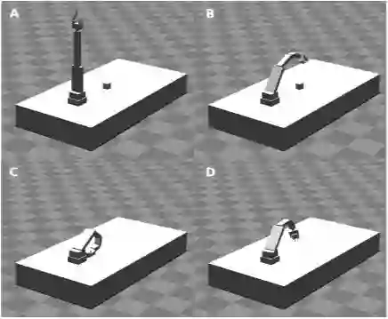 在 Ecarlat 和同事的工作中,一个名为 MAP-Elites 的进化算法被用来探索机器手臂与放在桌上的小盒子之间可能的互动方式。这个研究的目标是收集各种各样的控制器,将小盒子移动到桌面上尽可能多的不同位置。在正常的实验设置中,MAP-Elites 可以将小盒子移动到桌面上,抓住它,甚至可以像投篮一样把小盒子扔进机器人前方的篮子里。