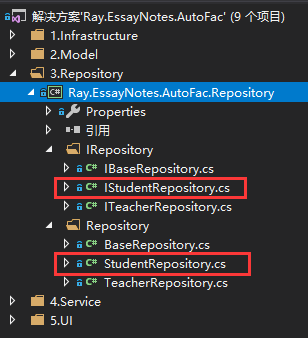 还拿上面的例子说明,现在我添加一个DAL的接口层,IStudentRepository,抽象出所需方法: