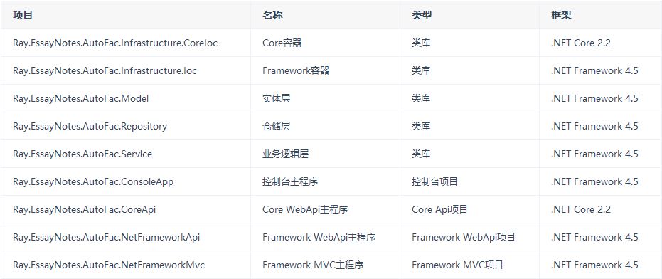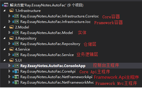 其中.NET Framework框架主要以如何引入AutoFac作为容器以及如何运用AuotoFac为主,.NET Core框架除了研究引入AutoFac的两种方式,同时也运用反射技巧对其自带的DI框架进行了初步封装,实现了相同的依赖注入效果。