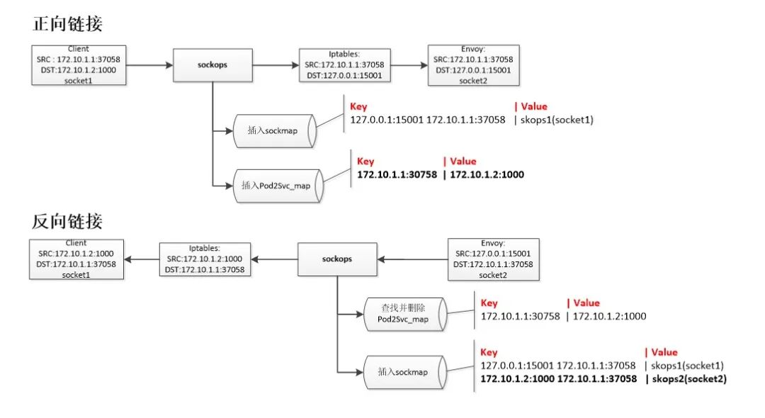 不过在 istio 环境中,该情况会变得稍微复杂一些,因为 istio 通过 iptables redirect 将 pod 访问 svc 的报文重定向到 envoy,加之 sockmap 的捕捉是在 iptable 规则之前,所以 sockmap 捕捉到的反向连接跟正向连接的源、目的地址不是一一对应的,找不到正向连接信息。我们的解决方案是新增一个 eBPF MAP,并在正向连接建立时,以源地址为 key,目的地址作为 value 存储起来,反向连接建立时根据反向链接的目的地址可以直接找到正向连接的完整信息。用一张图可以比较清晰的看懂这个过程: