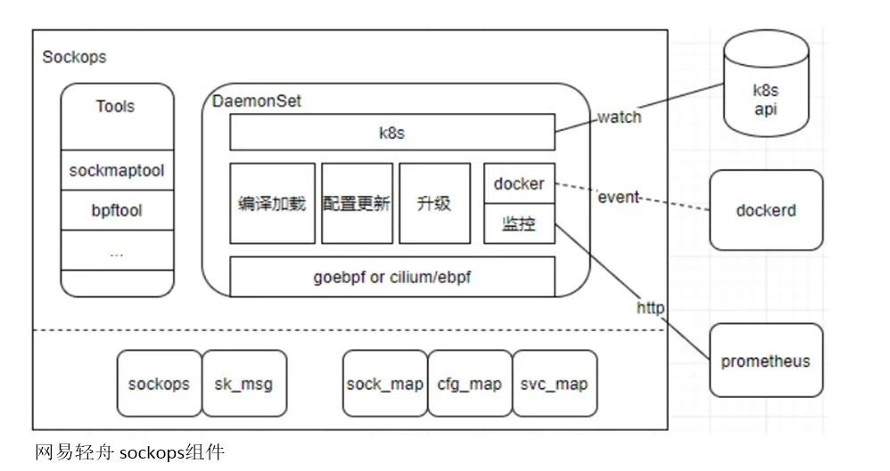 用户态 DaemonSet 程序,主要负责一些管控面的操作,包括监控 K8S、docker 的一些信息或者事件,然后动态更新 eBPF 程序的配置(用来支持细粒度开启关闭 sockops 功能),还包括编译加载 eBPF 程序、提供整个 sockops 组件的升级、对接 prometheus 提供自身的一些监控信息等功能;