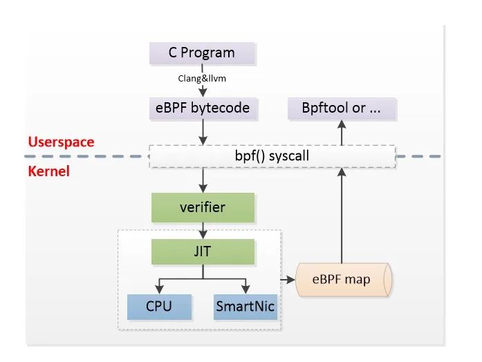 eBPF 支持在用户态将 C 语言编写的一小段“内核代码”注入到内核中运行,注入时要先用 llvm 编译得到使用 BPF 指令集的 ELF 文件,然后从 ELF 文件中解析出可以注入内核的部分,最后用 bpf_load_program() 方法完成注入。用户态程序和注入到内核中的程序通过共用一个位于内核中的 eBPF MAP 实现通信。为了防止注入的代码导致内核崩溃,eBPF 会对注入的代码进行严格检查,拒绝不合格的代码的注入。