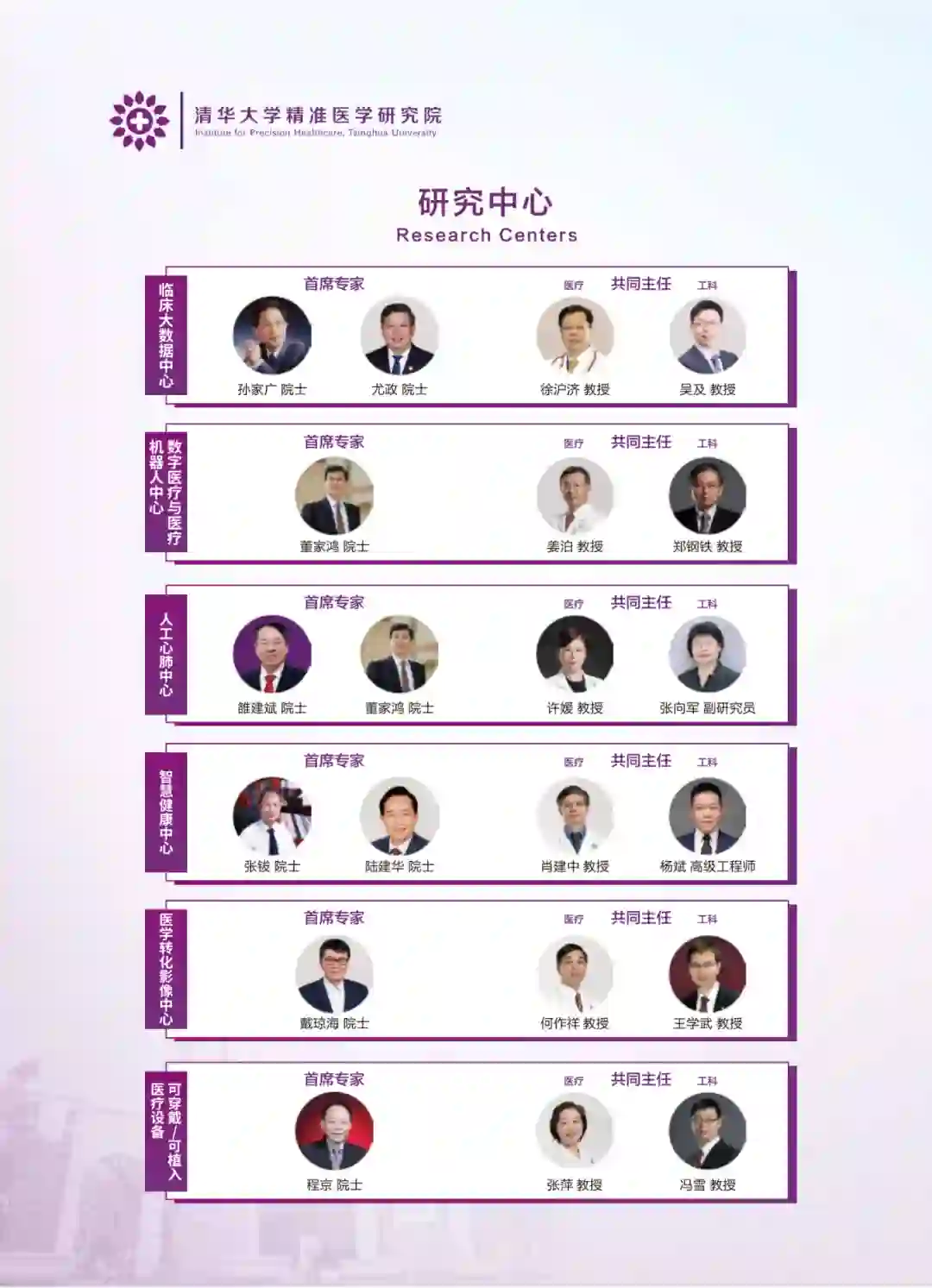 清华大学精准医学研究院成立于2016年1月,是清华大学临床医学与理工学科的交叉融合创新平台。研究院以服务健康中国和全球健康为使命,立足重大疾病防治需求和现代科学技术前沿,致力于健康医疗的核心技术和先进产品研发。研究院以精准医疗范式为引领,以临床和市场需求为双引擎,采用临床问题驱动型研究(Clinic-Driven Research,CDR)模式和健康产品导向型研发(Bedside to Bench to Customer,BBC) 模式,充分发挥清华大学临床医学资源优势和多学科融合创新优势,促进现代科学技术的临床转化应用和健康产品研发,打造医研企一体化的创新联盟和生态体系,推进健康医疗服务体系的重塑与健康医疗产业的发展。与此同时,重点构建复合型医工结合创新人才培养的平台和模式,培养适应社会经济发展与健康医疗产业兴起的医学创新领军人才,为推进人类健康医学事业做出应有贡献。