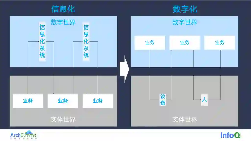 简言之,传统的信息化是把实体世界的业务转变成数字化形式,一切业务数据化,数字化转型则是通过数据指导实体业务,这就是两者最大的区别,本质上数据已经是业务的数字化存在形式。