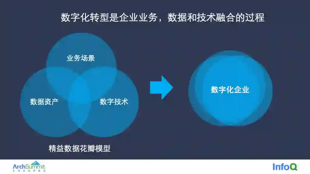 企业的业务、数据和技术看做是三个圆,随着企业数字化转型的深入,这三个圆慢慢融合成一个圈,也就成为了数字化企业。