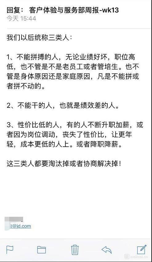3 月 31 日,京东员工在脉脉上爆料称,京东发布内部邮件,要求淘汰三类人: