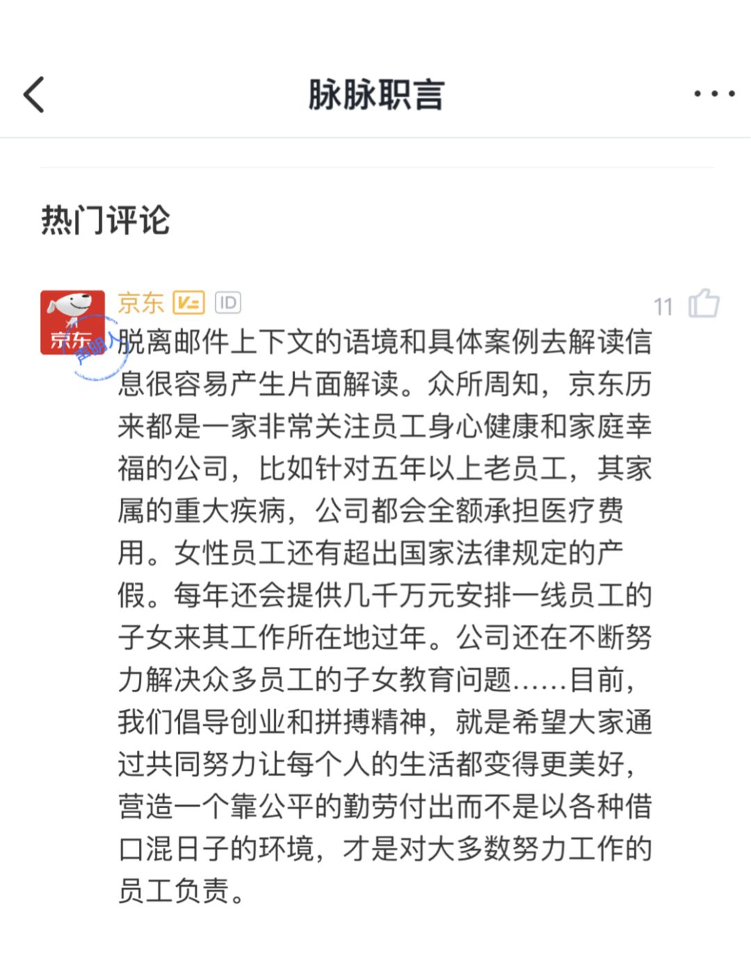 此后京东方面在脉脉给出官方回应,称这是脱离语境和具体案例得出的片面解读: