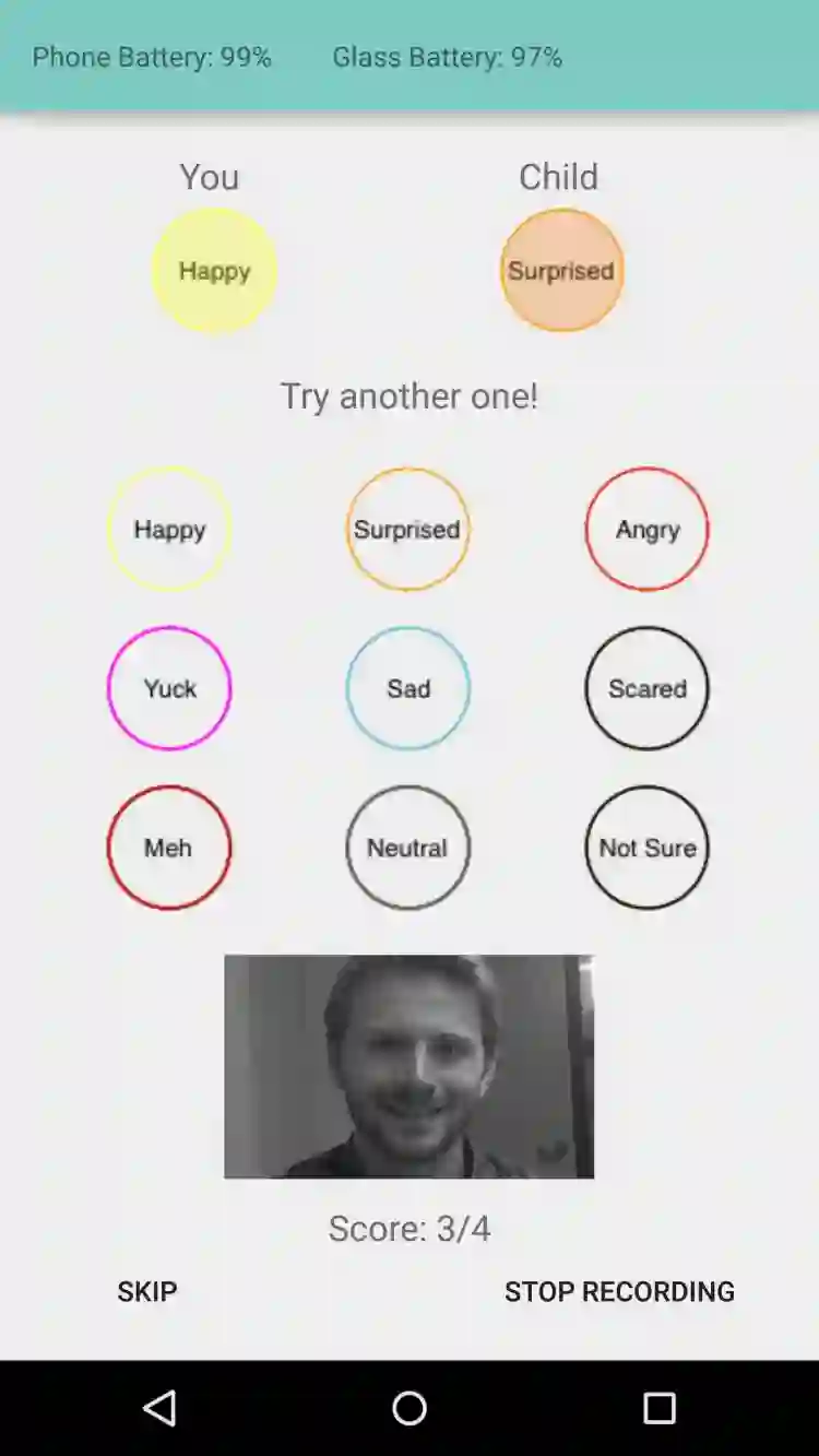 实验中,Google Glass的计算机视觉系统,无线连接到智能手机应用程序,为佩戴设备的孩子提供干预。该系统以答曰每秒15-20真的速率运行,通常100毫秒内就可识别出面部表情。