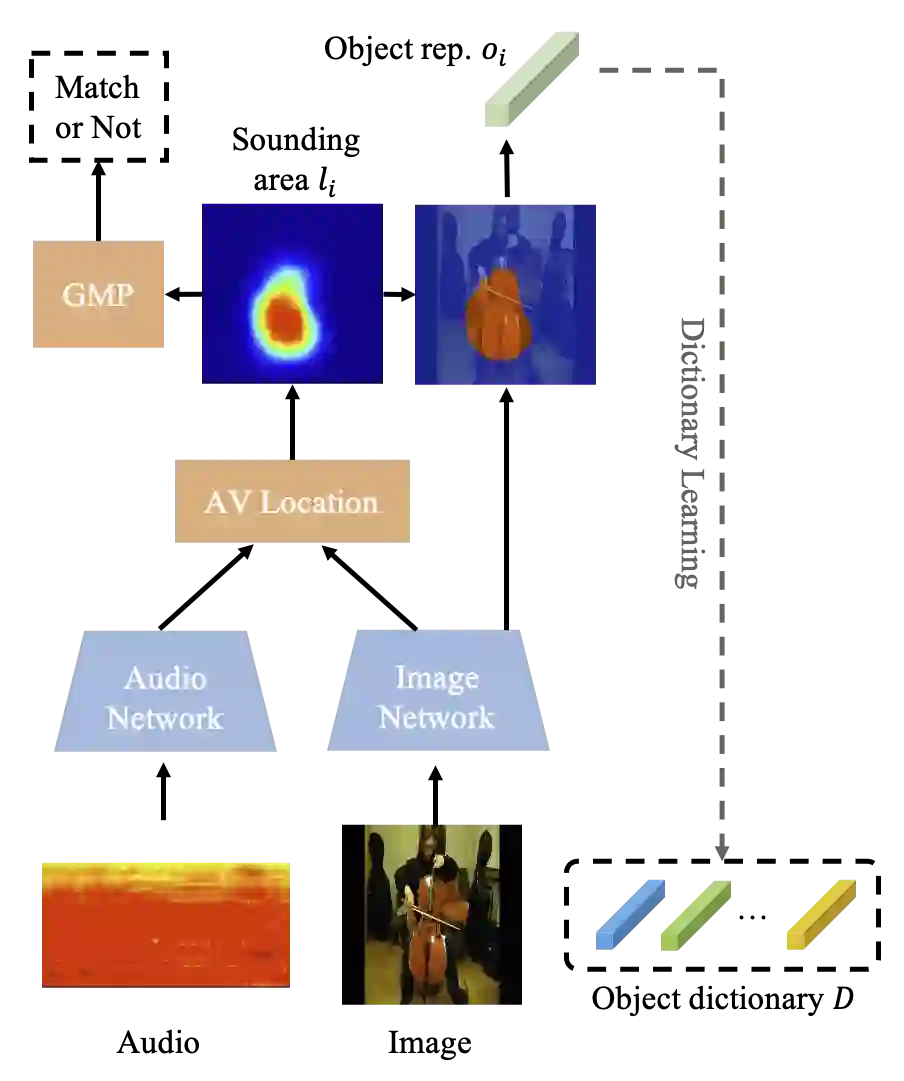 通过解决判别性声源定位任务构建对不同类别物体视觉表征的认知,并将其迁移到其他经典视觉任务中,如物体检测等。