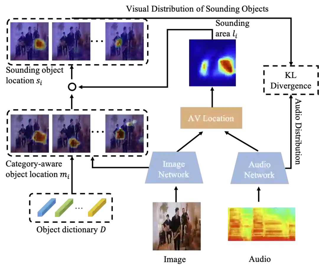 受人类视音感知能力的启发,提出了判别性多声源定位任务:不仅定位出发声物体的位置而且辨别其类别。