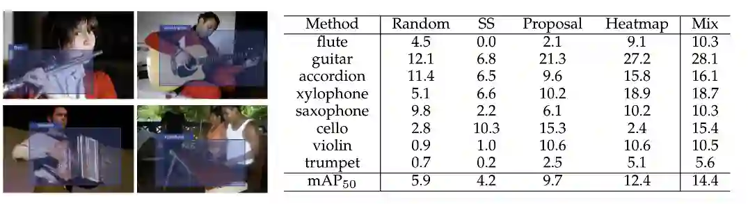 在拓展实验中,该研究利用单声源定位所得到的定位图构造物体的边界框,并与物体的类别伪标签一起作为监督信号,在无需物体检测标注的情况下训练物体检测器。ImageNet 子集上的可视化及定量实验结果表明,该无监督物体检测思路具有一定的可行性,尤其是在吉他等体积较大的物体类别上。这一实验验证了这种从判别性声源定位任务出发挖掘物体视觉知识并迁移到视觉领域其他任务上的思路具有应用前景。