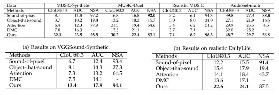 文中在涵盖了音乐、日常生活场景等广泛类别的多个真实及合成数据集上进行了多声源定位的实验,并分别进行了可视化及定量分析。在可视化定位图中,每张图展示了一类物体的定位结果,且发声物体有较大响应,而不发声物体未响应或响应很低。可以看到,尤其在合成的含有不发声物体的复杂多声源场景中,该方法具有较大优势。并且,该方法进一步在声源定位的基础上具有辨别出物体的类别能力。