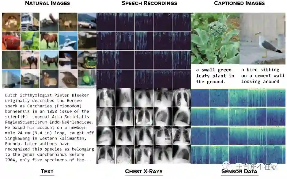 DABS是由斯坦福大学从多个数据集中收集整理的,其被用于进行领域无关(Domain-agnostic)的自监督学习。其包括6个模态的数据:自然图像、语音、文本、医学图像、传感器、带有标注的图片。该数据集要求开发的新算法必须在所有的模态上进行自监督训练,然后迁移到属于这些领域的若干个下游任务,以此来评价方法对于领域无关的数据的有效性。如下图所示。