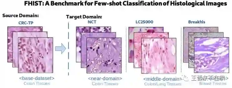 FHIST是一个由多个公开数据集组成的医学数据集,其主要是分类任务,由CRC-TP、NCT-CRC-He-100K、LC25000、BreakHis这四个公开数据集构成,其中每个公开数据集可以当做一个domain(但它们的类别彼此不同)。论文建议由数量最多的CRC-TP当做source domain,其他三个按照与其相关程度分别当做3个target domain来测试元学习和迁移学习算法,如下图所示:
