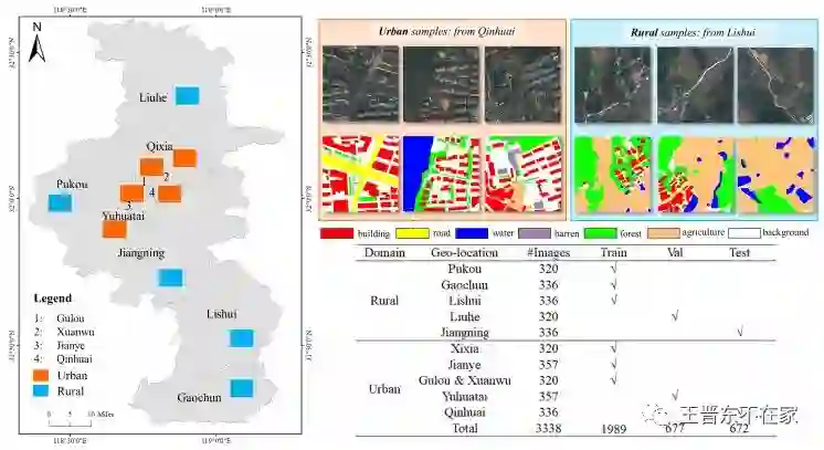 LoveDA (名字挺好)是由武汉大学开放的一个用于评价领域自适应 (Domain adaptation)算法在遥感图像上进行语义分割的数据集。它包含了7个类别、3338张图像,由来自城市和郊区的图像组成,它包含了86516个图像标注。如下图所示。
