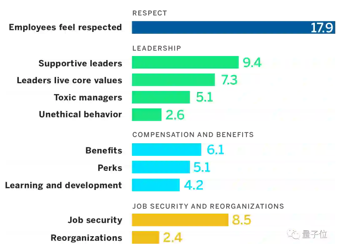 上图中列举了五个最大的离职原因,分别是有毒的企业文化、工作没有安全感、公司创新性太强、公司赏罚不分明、对新冠的应对比较差劲。