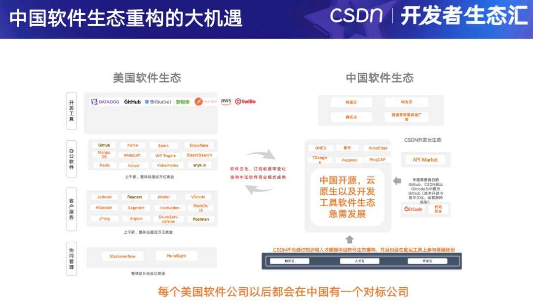 因此,在全球化生态发展的今天,中国数字经济想要领先全球,必须成为开源创造强国。这使得中国软件生态重构必须打造自己的技术生态。