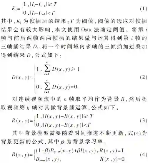 由于在发生火情形成烟雾的情况下烟雾不是静止不动的而是运动状态,因此可以对视频中运动物体进行检测来提取疑似烟雾目标,但是由于烟雾具有移动缓慢的特点,传统的光流法、帧间插法、背景插法等运动检测算法检测效果不佳。针对这些不足,本文综合帧插与背景插法结果叠加从而准确有效地检测运动区域。