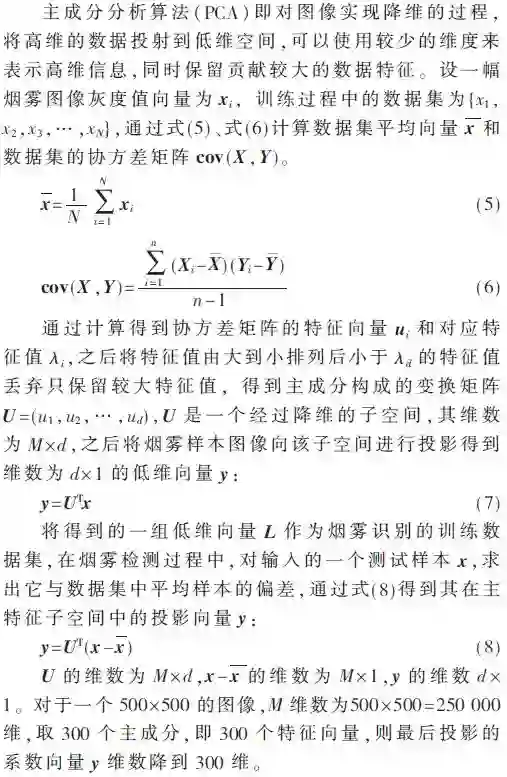 深度学习通过对数据的特征分析从而完成对模型的训练,通常一个图像数据中包含了大量信息,而对最终的学习效果产生影响的只有主要特征,而大量特征造成了数据冗余而使得运算效率大打折扣。一个500×500大小的视频帧图像其原始特征就会达到M=250 000维,这在应用过程中产生了庞大的运算量,严重影响到运算效率。由于本文应用的系统目标是对烟雾进行实时的监控报警,对算法实时性有较高要求,因此为了减少图像在训练、测试和检测过程中的运算量、提高运算效率,对图像数据使用经验值法[6]进行灰度化处理后利用PCA算法进行数据的降维处理,以减少无关特征的影响。