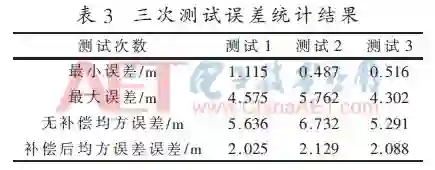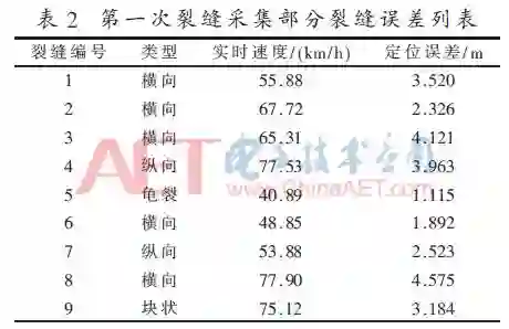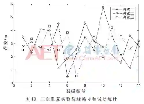 在运动过程中对路面上破损进行实时采集和运动补偿,对该路段进行了3次裂缝采集,并将本系统采集的路面裂缝的编号和误差进行作图分析。表2给出了在第一次测试采集裂缝的个数、编号、实时速度和定位误差。图10给出了3次重复采集的裂缝误差信息。表3是3次测试误差的统计结果。