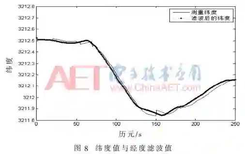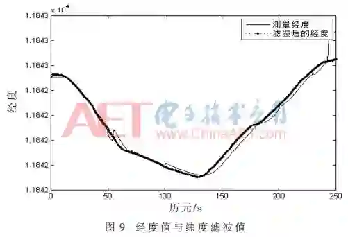 图8是滤波后的纬度和滤波前的纬度比较,图9是滤波后的经度和滤波前的经度比较。以经度为118.425 123°,纬度为32.125 222°坐标为起始位置,从图中可以看出由于实验过程中学校内部的高楼和树木较多,导致系统的误差较大。通过EKF滤波后经纬度值更加接近真实值。