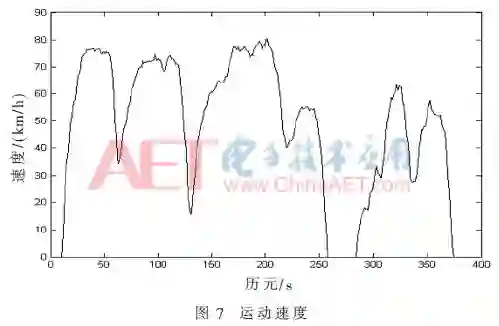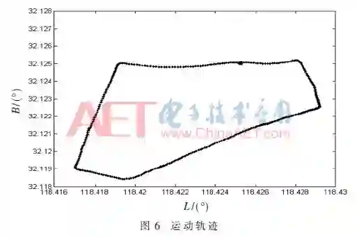 为了验证该算法的有效性和实时性,本课题组于2017年12月20日在南京信息工程大学进行路面破损采集定位测试。试验设备是由泰斗D303北斗芯片接收数据,在一定时间内进行定位数据的采集,如时间、纬度、经度、速度、航向和方位角等。采样频率为1 Hz。图6是经纬度运动轨迹,图7是速度的变化量.