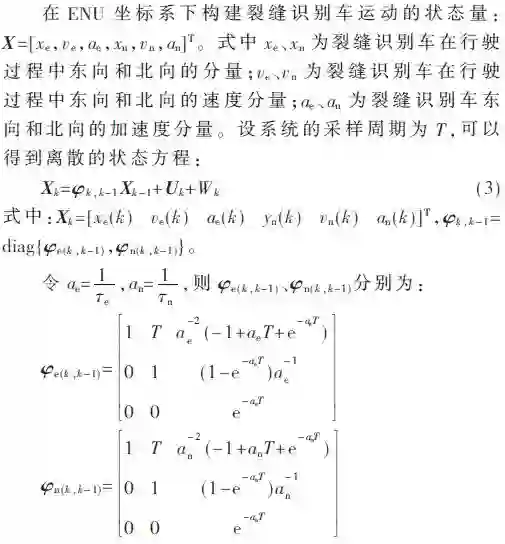 通过EKF来对裂缝识别车在行驶过程中由于树木或者高楼引起的多径效应的误差进行修正,来得到更加精确的识别车的定位精度。