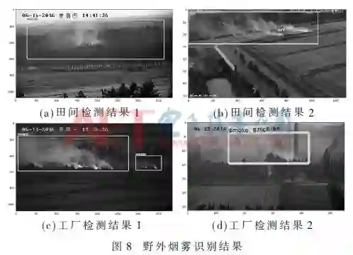 图8展示了本文算法在某地秸秆焚烧监控系统中的实际应用效果,识别过程中将模型认为是烟雾区域概率大于50%的区域进行了框选,4幅图像均采用了室外秸秆焚烧的烟雾图像,可以看出烟雾均被准确检测。