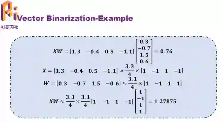 下面举个例子,如何运用向量二值化来二值化向量的內积。如下是四维向量相乘的例子: